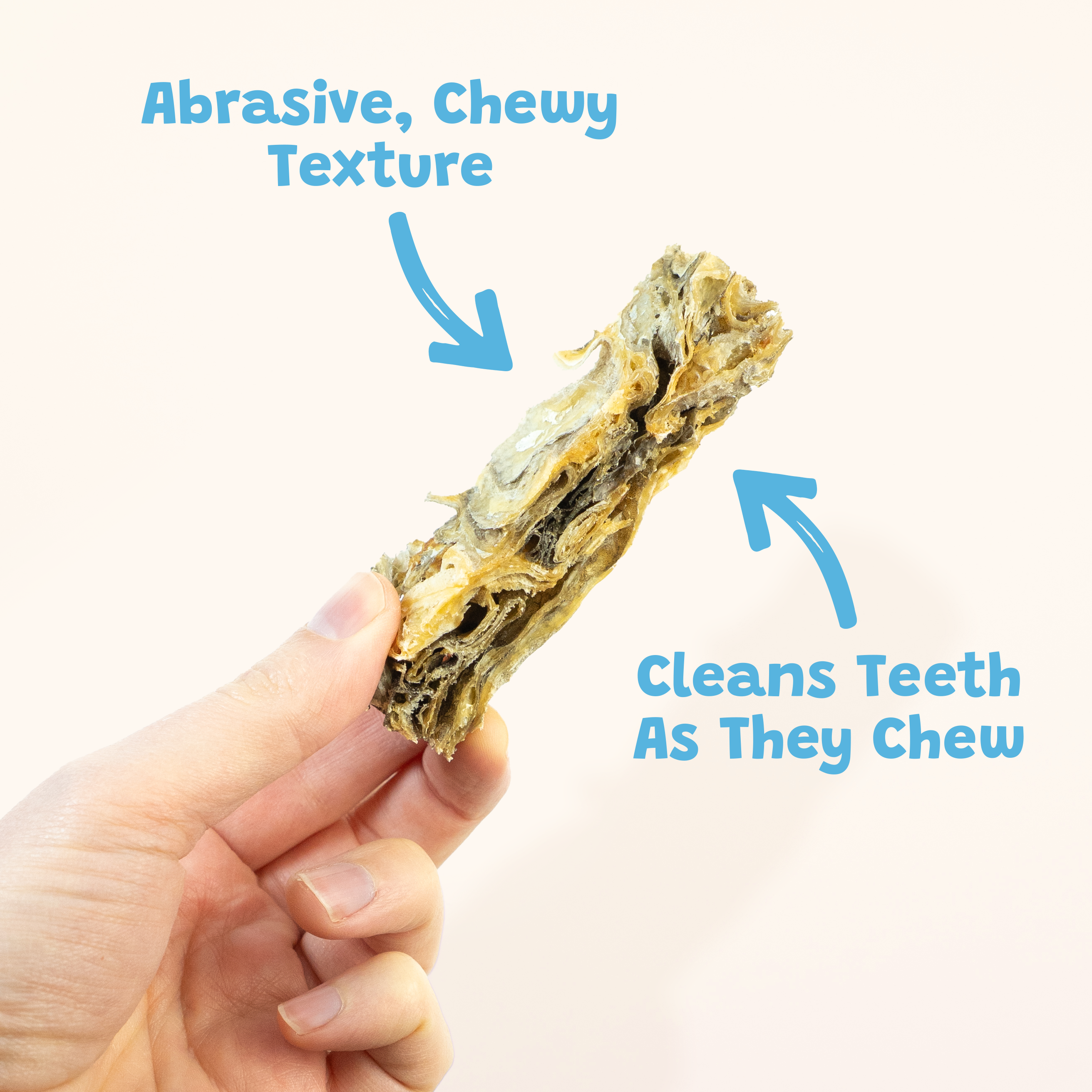 The naturally abrasive texture helps with teeth cleaning whilst also being low in fat and packed with highly digestible protein.