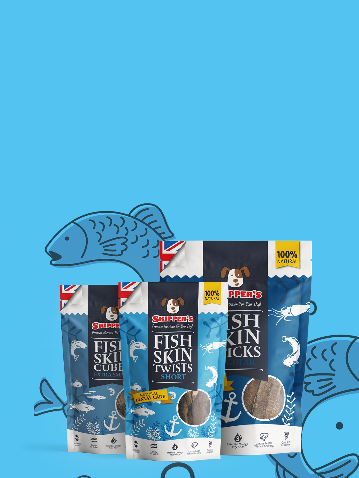 Our Fish Finger Skins are perfect for helping clean dogs teeth with their abrasive texture, and they're packed with Omega oils too to help their skin, coat and joints!